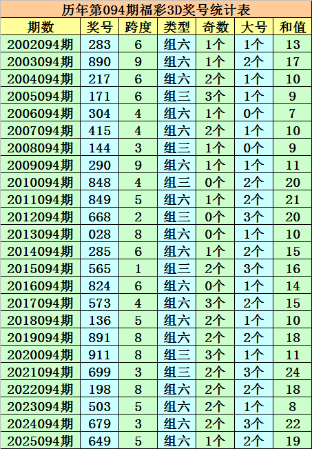 历年第094期福彩3D同期奖号为:283 - 890 - 217 - 171 - 304 - 415 - 144 - 290 - 848 - 849 - 668 - 028 - 285 - 565 - 824 - 573 - 136 - 891 - 911 - 699 - 198 - 503 - 679 - 649。